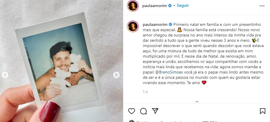 Breno, por sua vez, também reagiu ao saber da notícia. Em um post nas redes sociais, ele desabafou sobre o momento de felicidade. "Nesse natal temos um presente mais que especial à nós e todos aqueles que torcem e desejam nossa felicidade.