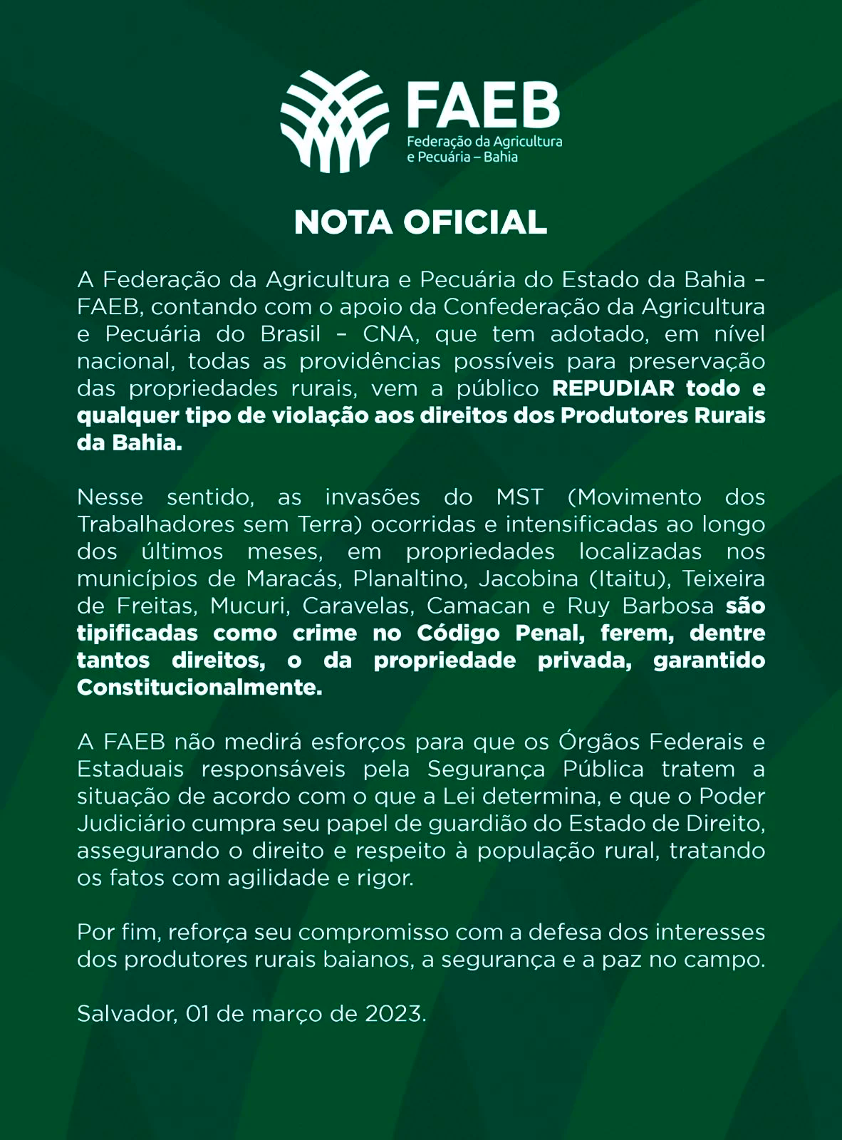 A Federação e Pecuária do Estado da Bahia (Faeb) também se manifestou sobre as invasões do MST às propriedades é uma das 10 maiores de celulose de mercado.