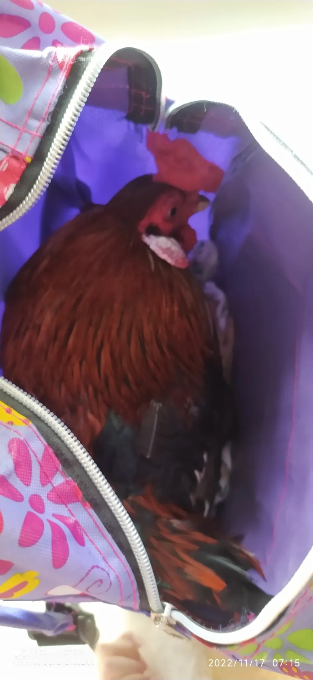 Sueli Miranda, professora da pequena criança, disse como descobriram a situação. "Eu estava na porta da sala recepcionando as crianças e pedi para ela guardar a mochila. Ela disse: 'mas eu trouxe um presente pra você'. Abriu a mochila e lá estava o galo", comentou ao portal G1. Segundo a docente, o galo estava assustado por conta do barulho das crianças na sala de aula.