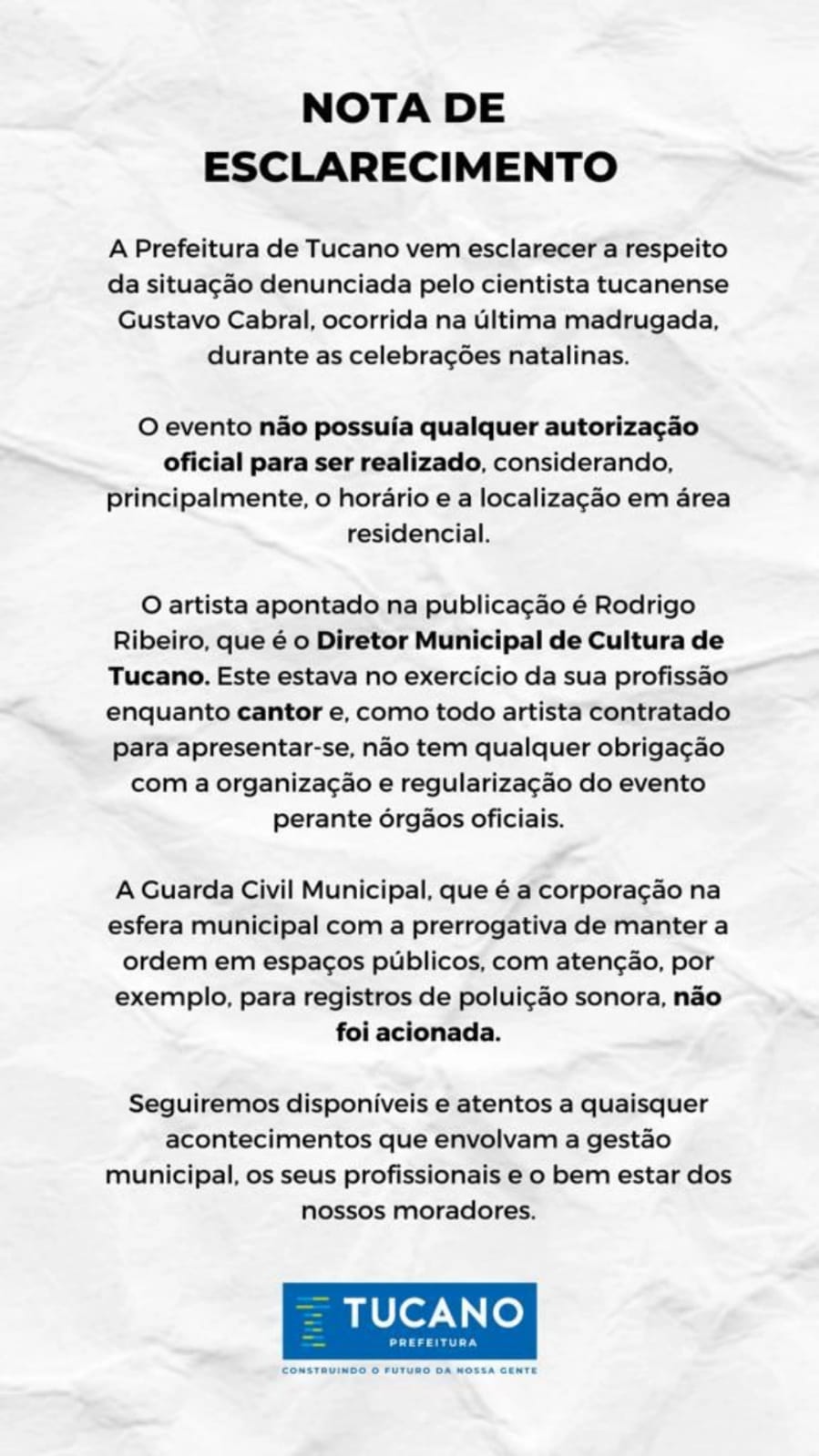 O imunologista Dr. Gustavo Cabral compartilhou uma denúncia enviada por um seguidor que preferiu não se identificar, da suposta participação do secretário de Cultura do município de Tucano, no interior da Bahia, em uma festa privada. Contudo, em nota em enviada a imprensa, a prefeitura da cidade confirmou a participação do diretor de Cultura, Rodrigo Ribeiro, na função de cantor.