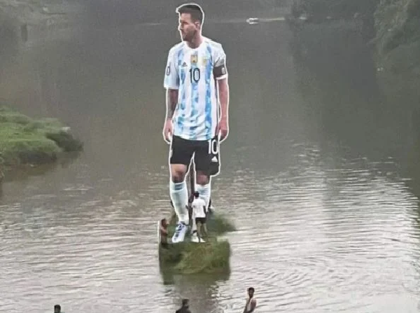 Fachadas de casas são pintadas em época de Copa no país, além de estátuas que foram erguidas, como a de Messi na margem de um rio, que tem aproximadamente 9 metros.