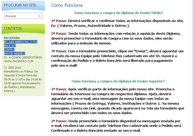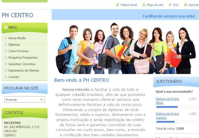 O site vende certificados nas diversas áreas de qualificação e garantem a autenticidade dos diplomas que seriam emitidos pela coordenação das instituições, registrados pelo Ministério da Educação (MEC) e também publicados no Diário Oficial. Ainda é divulgado o endereço físico da PHCentro que estaria localizada na Avenida das Americas, no centro do Rio de Janeiro.