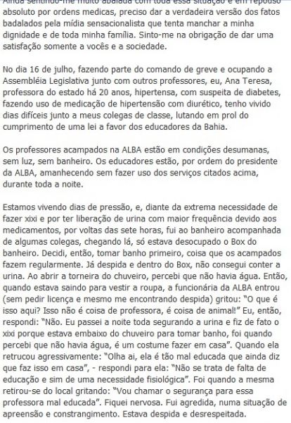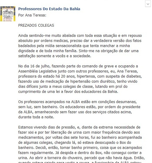 No dia 16 de julho, fazendo parte do comando de greve e ocupando a Assembléia Legislativa junto com outros professores, eu, Ana Teresa, professora do estado há 20 anos, hipertensa, com suspeita de diabetes, fazendo uso de medicação de hipertensão com diurético, tenho vivido dias difíceis junto a meus colegas de classe, lutando em prol do cumprimento de uma lei a favor dos educadores da Bahia.