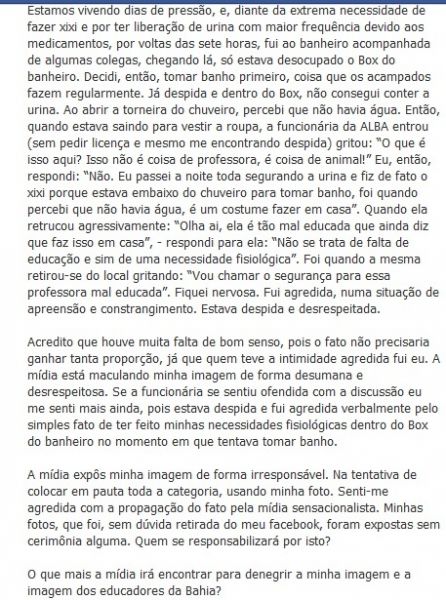 Estamos vivendo dias de pressão, e, diante da extrema necessidade de fazer xixi e por ter liberação de urina com maior frequência devido aos medicamentos, por voltas das sete horas, fui ao banheiro acompanhada de algumas colegas, chegando lá, só estava desocupado o Box do banheiro. Decidi, então, tomar banho primeiro, coisa que os acampados fazem regularmente. Já despida e dentro do Box, não consegui conter a urina. Ao abrir a torneira do chuveiro, percebi que não havia água. Então, quando estava saindo para vestir a roupa, a funcionária da ALBA entrou (sem pedir licença e mesmo me encontrando despida) gritou: “O que é isso aqui? Isso não é coisa de professora, é coisa de animal!” Eu, então, respondi: “Não. Eu passei a noite toda segurando a urina e fiz de fato o xixi porque estava embaixo do chuveiro para tomar banho, foi quando percebi que não havia água, é um costume fazer em casa”. Quando ela retrucou agressivamente: “Olha ai, ela é tão mal educada que ainda diz que faz isso em casa”, - respondi para ela: “Não se trata de falta de educação e sim de uma necessidade fisiológica”. Foi quando a mesma retirou-se do local gritando: “Vou chamar o segurança para essa professora mal educada”. Fiquei nervosa. Fui agredida, numa situação de apreensão e constrangimento. Estava despida e desrespeitada.