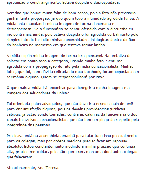 A professora Ana Teresa, acusada de humilhar a funcionária da Assembleia Legislativa, de prenome Cláudia, emitiu na manhã desta sexta-feira (20) uma carta aos colegas através do facebook, falando sobre o caso e que "preciso dar a verdadeira versão dos fatos badalados pela mídia sensacionalista que tenta manchar a minha dignidade e de toda minha família, Sinto-me na obrigação de dar uma satisfação somente a vocês e a sociedade".
