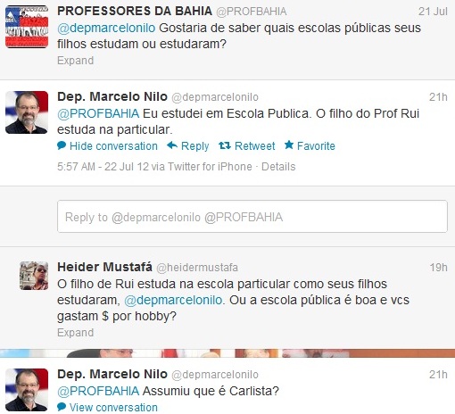 Ontem, a categoria questionou de Nilo em qual escola pública ele teria estudado. Provocando, Nilo rebateu criticando o presidente da Associação dos Professores do Estado da Bahia (APLB), Rui Oliveira. "O filho do Prof. Rui estuda em escola particular".