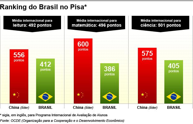 O país ficou bem abaixo da média da OCDE, de 496 pontos. Os cinco melhores colocados são China (Xangai), com 577 pontos, Hong Kong, com 546, Finlândia e Cingapura, com 543, e Coréia do Sul, com 541.