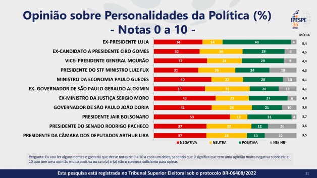 Bolsonaro foi considerado a “personalidade da política”, com a pior avaliação em uma lista de inclui Lula, Sérgio Moro, Hamilton Mourão Luiz Fux, Paulo Guedes, Rodrigo Pacheco e Arthur Lira, dentre outros.