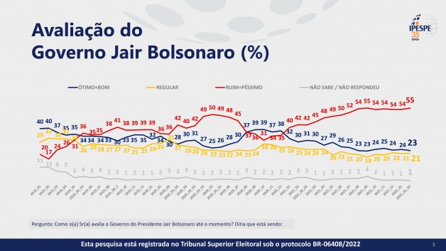 O atual Presidente Jair Bolsonaro alcançou a pior avaliação deste o início do mandato, segundo pesquisa feita pelo Ipespe/XP, divulgada nesta quinta (27). 55% dos entrevistados classificam como ruim ou péssimo. O presidente tem desaprovação de 64%, ante aprovação de 29%, conforme o levantamento. 23% o avaliam como ótimo ou bom e 21%, como regular.