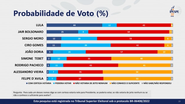 Já a pesquisa para intenção de voto nas eleições de outubro deste ano, o ex-presidente Lula vem liderando com 44%; Jair Bolsonaro aparece em segundo lugar, com 24%; o ex-juiz Sergio Moro (Podemos) e o ex-governador do Ceará Ciro Gomes (PDT) empatam na terceira posição, com 8%; em seguida vem o governador de São Paulo, João Doria (PSDB), com 2% das intenções de voto; empatados com 1% estão Simone Tebet (MDB), Alessandro Vieira (Cidadania) e Felipe d’Ávila (NOVO).