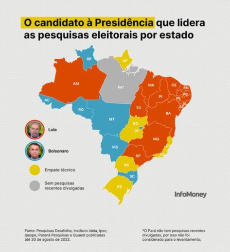 O ex-presidente Lula (PT) lidera a disputa à Presidência entre os eleitores de ao menos 13 estados do país. Os dados foram compilados pelo InfoMoney, baseado em pesquisas de intenção de votos divulgadas até então.