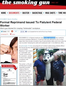 Um funcionário público de 38 anos, do governo federal dos EUA, no dia 10 de dezembro foi formalmente acusado de criar um "intolerável" ambiente de trabalho devido aos seus odorentos e frequentes gases, de acordo com informações publicadas pelo site The Smoking Gun.