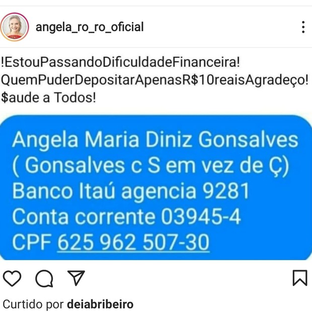 "Estou passando dificuldade financeira! Quem puder depositar apenas R$ 10 reais, agradeço! Saúde a todos!", disse Ro Ro.