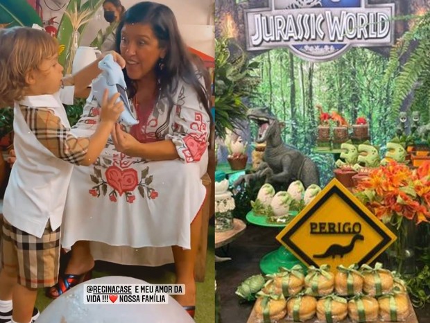 Isis Valverde e o marido, André Resende, fizeram neste sábado (27) uma superfesta de aniversário para celebrar os 3 anos do filho, Rael. O evento teve como tema o filme Jurassic Park (Parque dos Dinossauros).