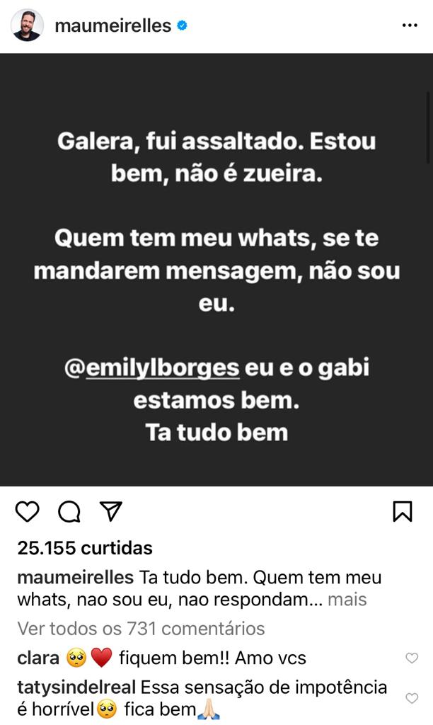 O humorista Maurício Meirelles, 38, anunciou neste sábado (9) que ele, sua esposa Emily Borges e seu filho Gabriel foram vítimas de um assalto à mão armada na noite de sexta-feira (8).