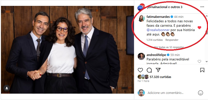 Em comentário no perfil oficial do JN no Instagram, Fátima, que também apresentou o noticiário por 14 anos, deixou uma mensagem de carinho ao ex-companheiro de bancada e aos colegas que assumem novas funções.