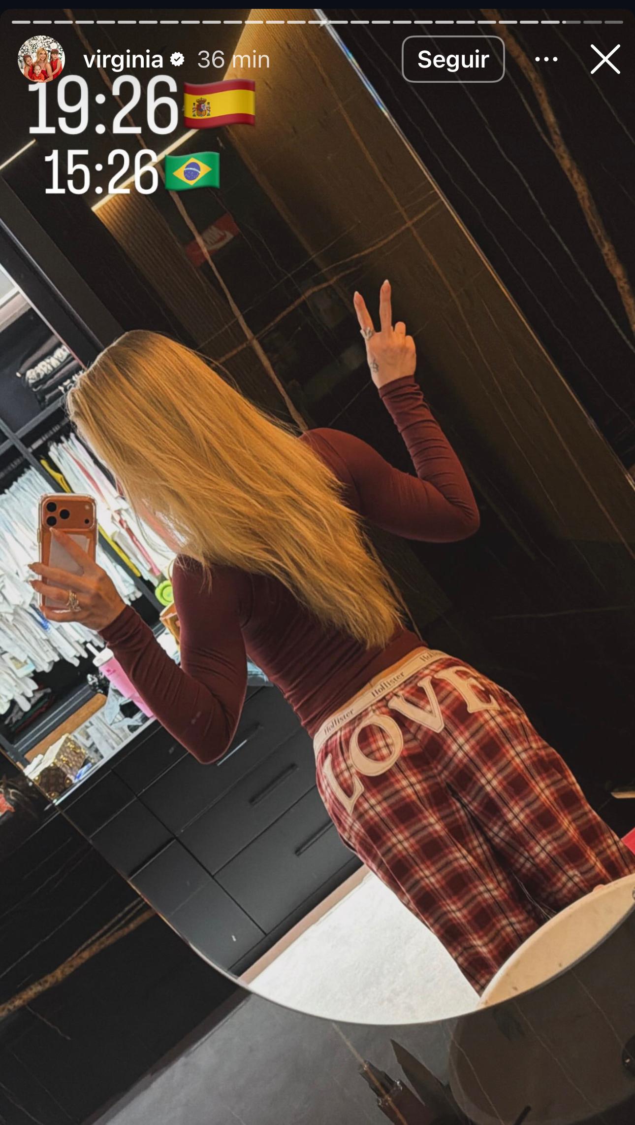 A empresária posou diante do espelho no closet do namorado, o jogador Vinícius Júnior, e chamou atenção ao usar uma calça xadrez com a palavra “LOVE” estampada na parte de trás.