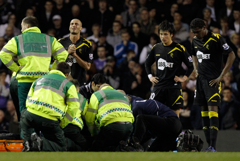 Neste sábado (17) durante o jogo entre Tottenham e Bolton, válido pelas quartas de final da Copa da Inglaterra, o volante do Bolton Fabrice Muamba, 23, caiu sozinho, aparentando sofrer um ataque cardíaco, quando a partida estava empatada em 1 a 1. O jogo foi parado para seu atendimento e, após alguns minutos, suspenso definitivamente pelo árbitro Howard Webb. Em seguida, o jogador foi retirado de maca e levado para o hospital.