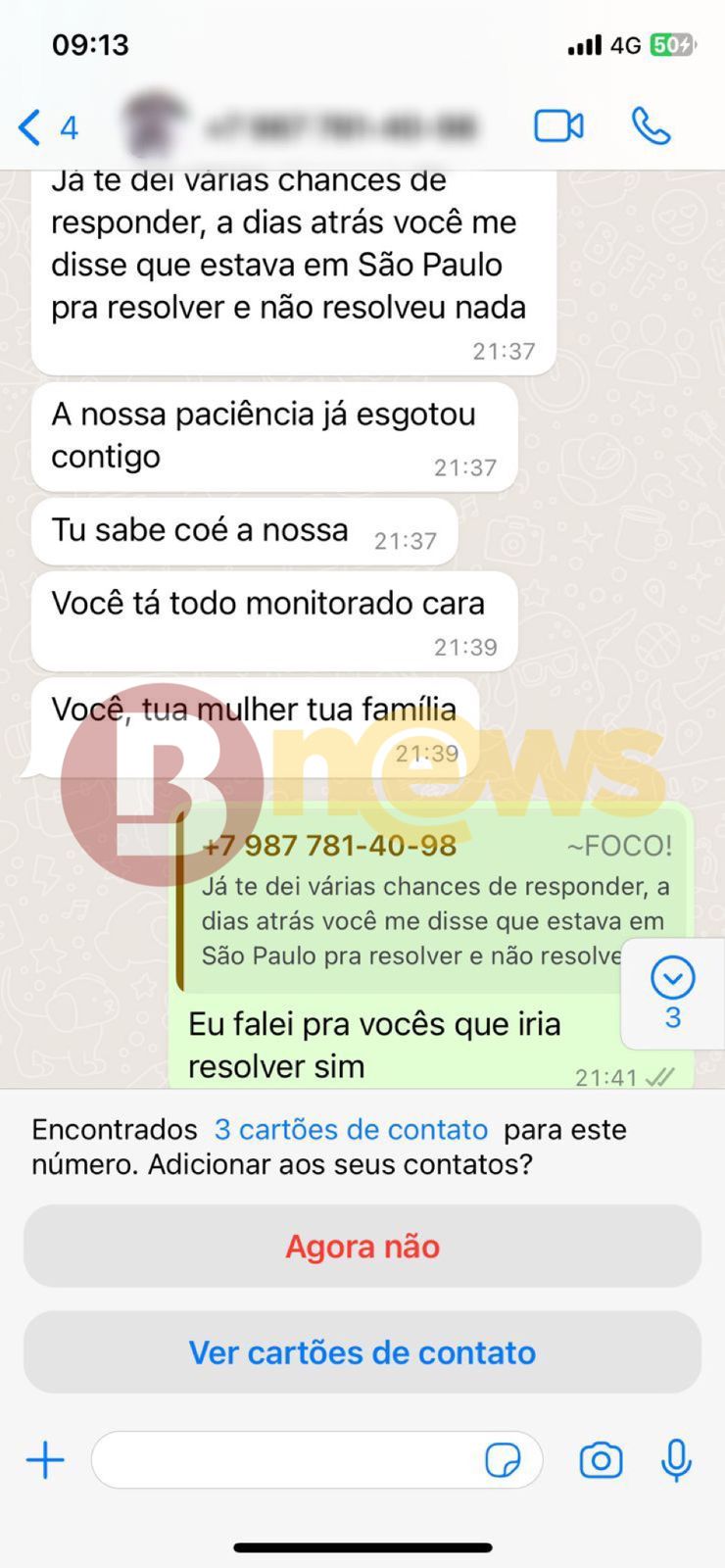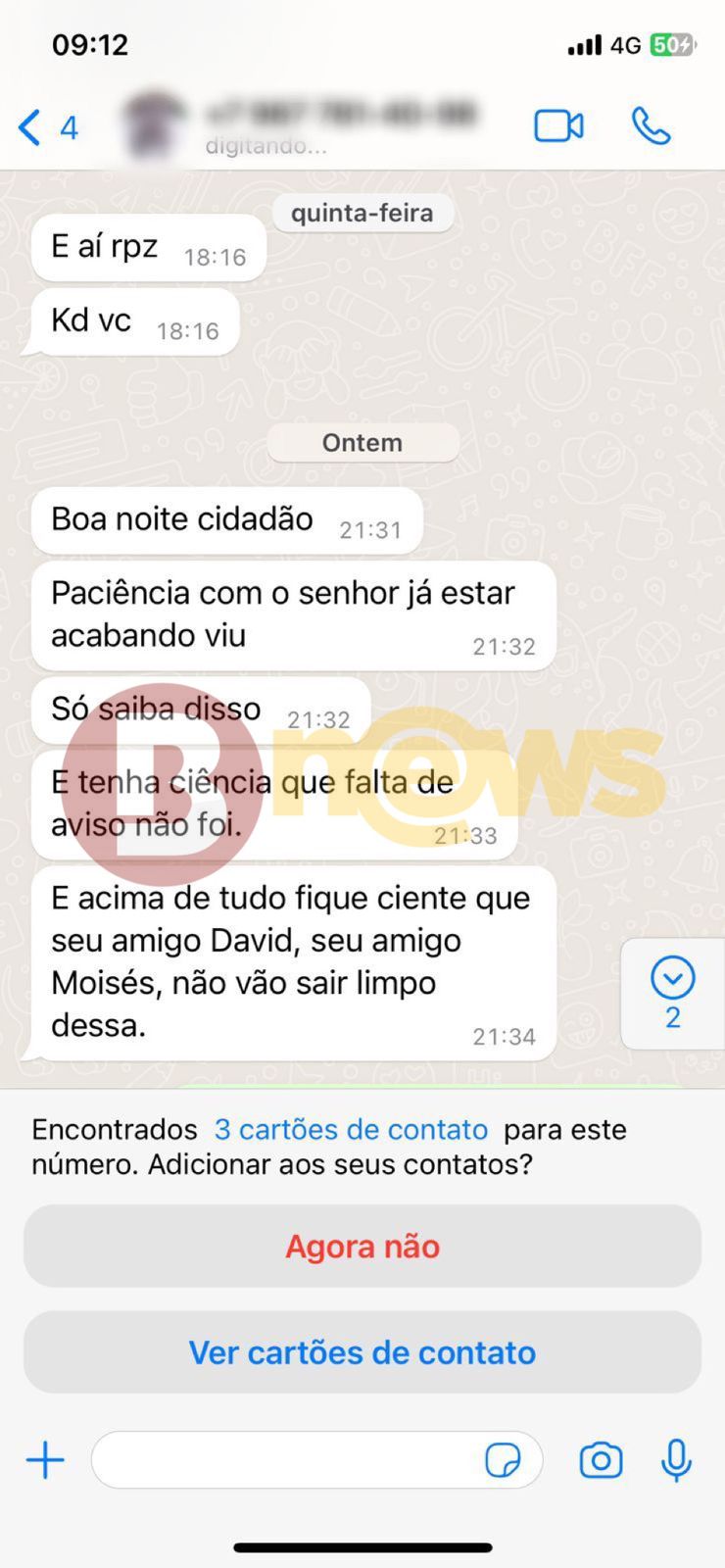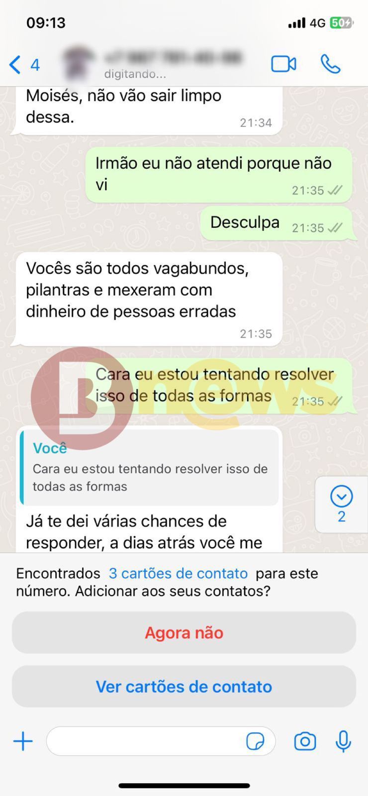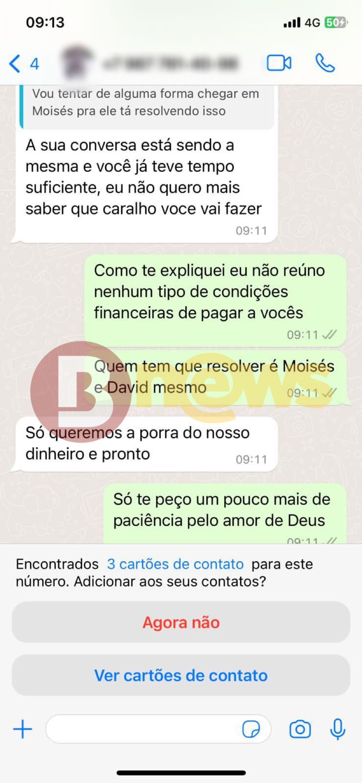 "Não sei qual foi a negociação de vocês aí, você, Moisés e o David. nós não queremos saber, só queremos o que é nosso. Trabalhou errado. Deixou nós aqui no prejuízo, prejuízo grande, e vai ser resolvido essa semana. Eu vou dar ultimato a vocês, senão vai ficar feia a coisa, viu?", finaliza em outro áudio.
