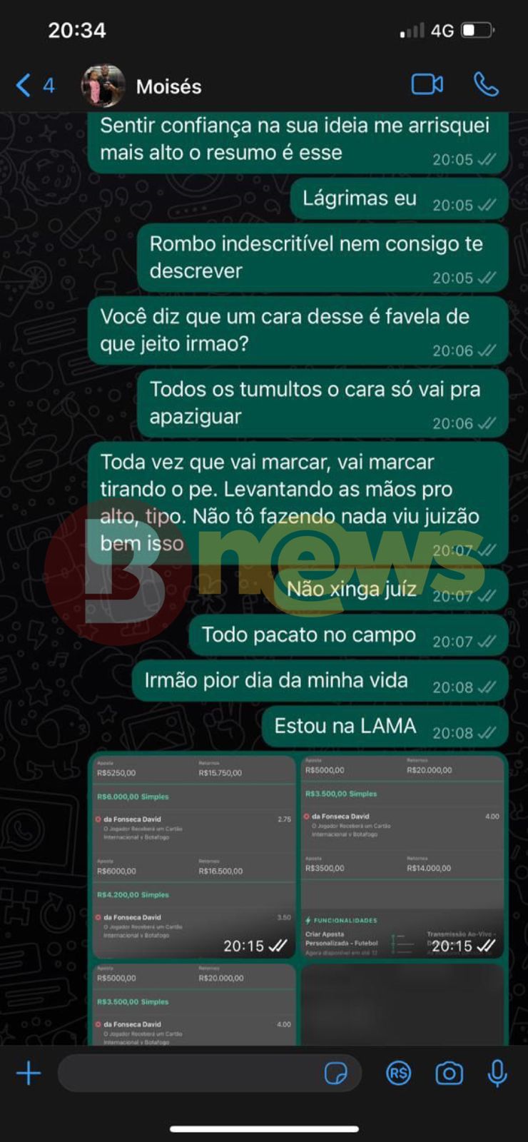 Em um print enviado pelo denunciante, ele mostra uma conversa com o defensor. Na imagem, ele diz que está "na lama" pelo fato de as apostas não terem dado certo.