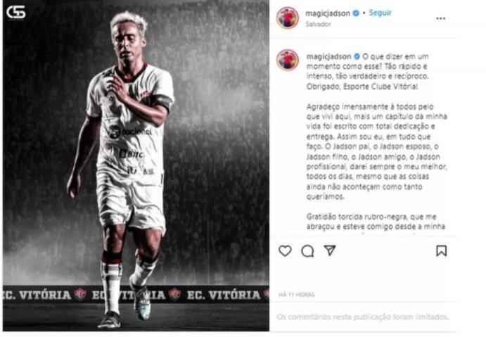 Uma semana após o Vitória confirmar o desligamento do meia Jadson, de 38 anos, o atleta usou suas redes sociais para se despedir do clube. O camisa 10 deixa à Toca após passar por um imbróglio no processo de rescisão de contrato.