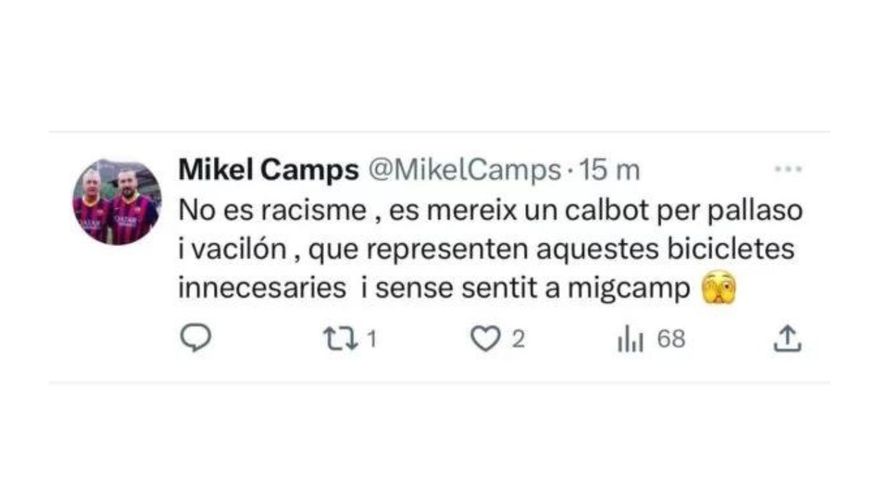 “Não é racismo, ele merece um tapa por ser palhaço e folgado. O que representam essas pedaladas desnecessárias e sem sentido no meio de campo?”, foi o que Mikel Camps postou, excluindo o post pouco tempo após a publicação.