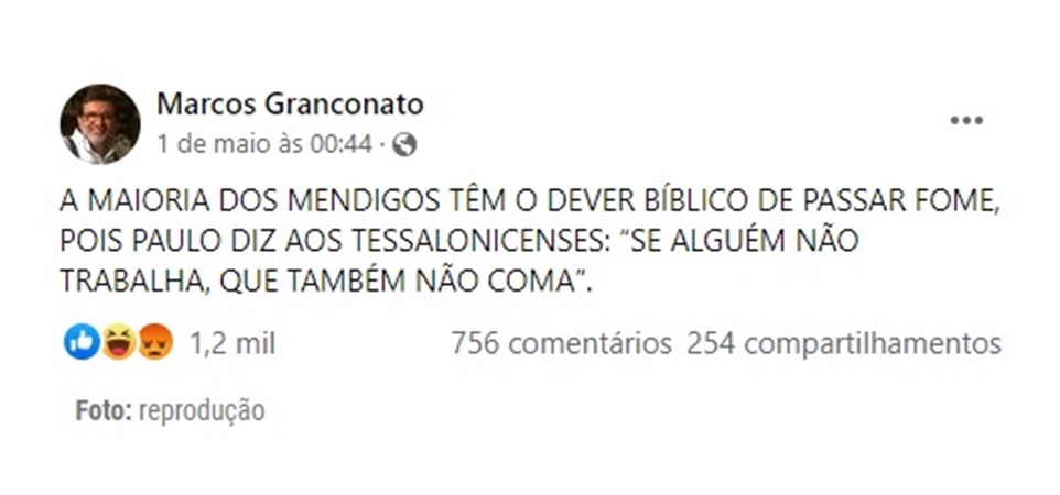 O pastor e líder da Igreja Batista Redenção de São Paulo, Marcos Granconato, causou polêmica ao defender que "mendigos têm o dever bíblico de passar fome" em uma publicação realizada nas redes sociais no último do domingo (1º). A opinião causou revolta entre os internautas.