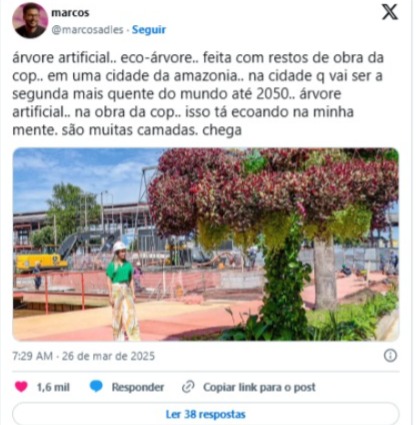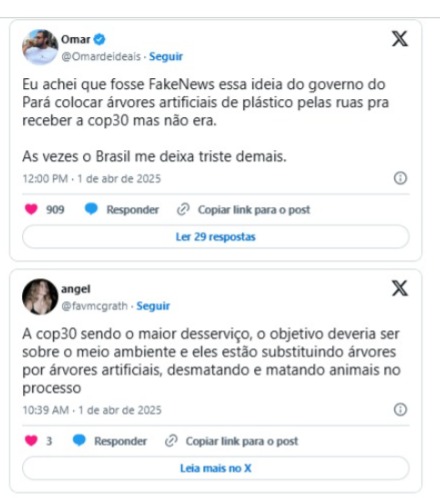 Uma polêmica, relacionada à 30ª Conferência das Nações Unidas sobre as Mudanças Climáticas de 2025, a COP30, está tomando conta das redes sociais, especialmente do X (antigo Twitter). Os internautas estão revoltados e se dizem constrangidos com a iniciativa do Governo do Pará em colocar árvores artificiais ' plantadas' no estado que irá, em novembro, sediar o evento ambiental mais importante da face da Terra.