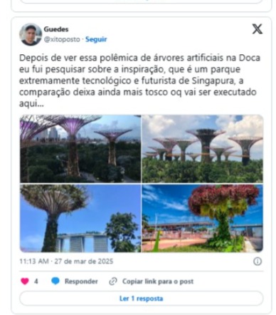Ainda, segundo a matéria de o portal Terra, “a Seop informou que foram construídas 188 árvores artificiais para compor a paisagem da capital da COP30, sendo 88 para o Parque Linear Nova Doca e 100 para o Parque Linear Nova Tamandaré."A função principal das eco-árvores é promover o sombreamento do Parque Linear, que dessa forma vai gerar um conforto térmico ao longo de todo o parque”, disse Thais Ribeiro, engenheira da Seop””.