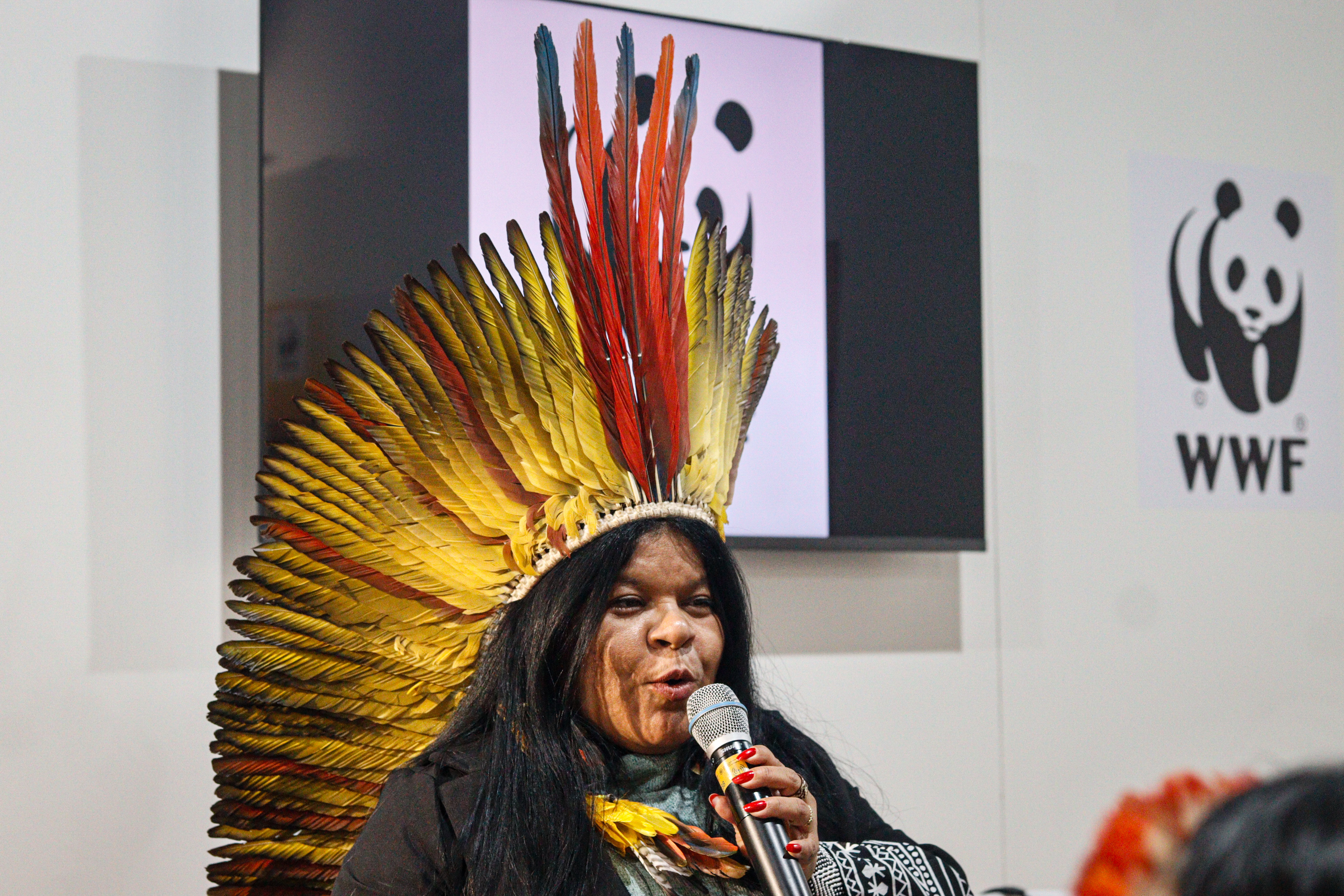 Ministra Sônia Guajajara, durante lançamento da Troika Indígena, em Baku, Azerbaijão