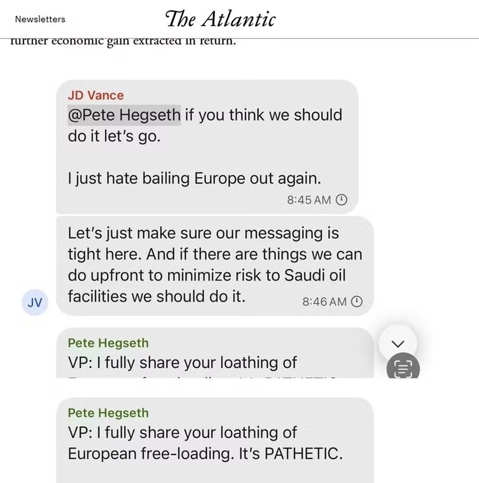 Em dado momento, JD Vance afirma: "Eu apenas odeio salvar a Europa de novo". A visão do governo Trump é que o continente europeu se beneficia das campanhas militares dos EUA no estrangeiro e não oferece contrapartidas suficientes a Washington.