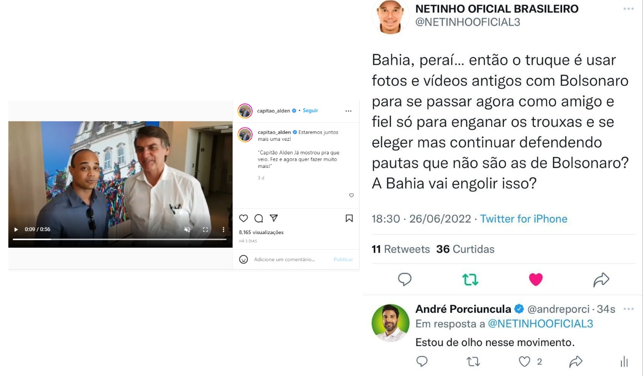 O deputado Alden arrumou a maior confusão entre bolsonaristas. Na sanha de tentar se colar na imagem de Bolsonaro, postou um vídeo antigo ao lado do capitão como se fosse novo. A gravação é tão velha que Bolsonaro ainda usava tintura Márcia nos cabelos. Até o cantor Netinho se retou no Twitter.