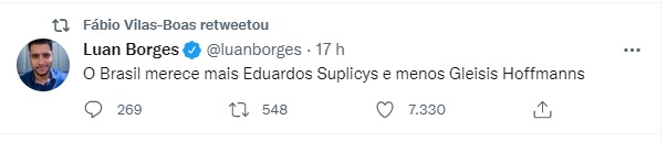Deu pra perceber que o ex-secretário de Saúde, Fábio Vilas-Boas anda insatisfeito com a presidente do PT, Gleise Holffmann. Pré-candidato a deputado federal, Fábio retuitou uma publicação que dizia que o país precisa de mais Suplicys e menos Gleisi Holffmann. A publicação foi feita logo após o vereador paulistano Eduardo Suplicy invadir uma reunião do PT. Resta saber o que é que a presidente da sigla anda fazendo pra desagradar tanto assim o ex-secretário.
