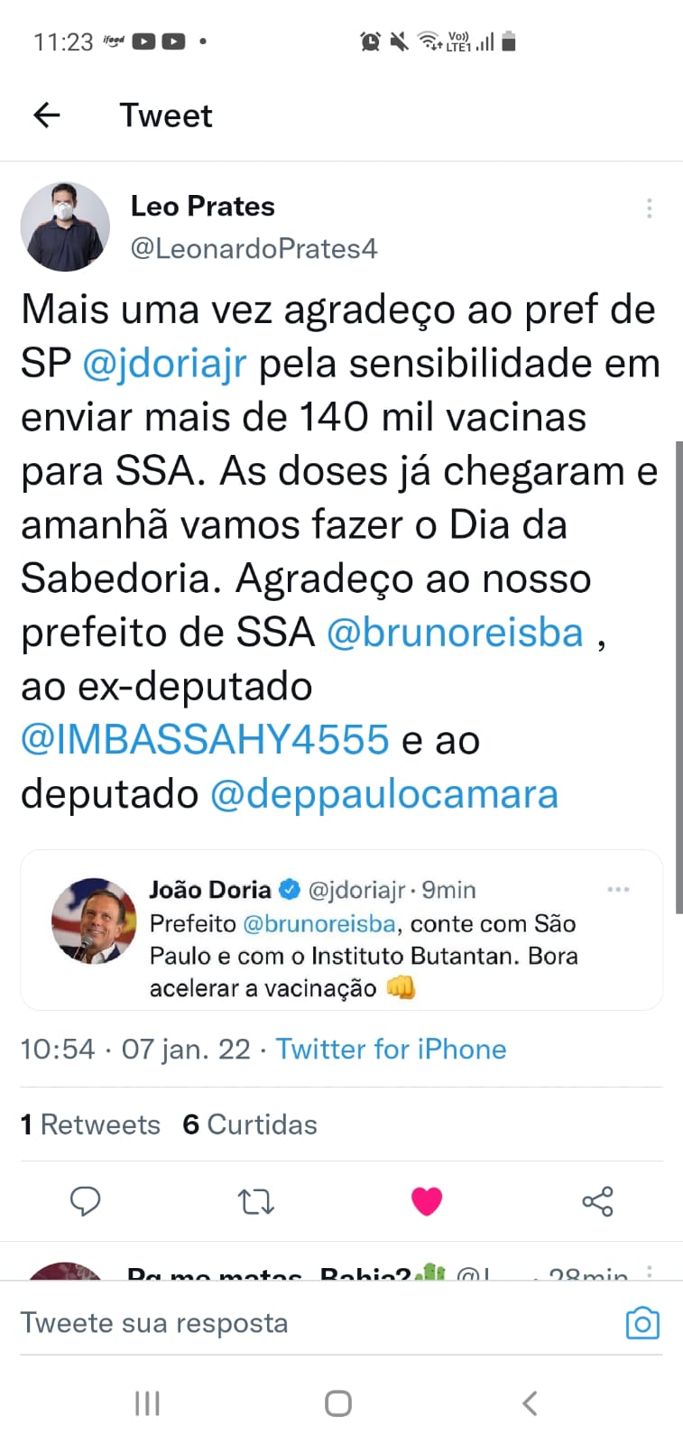 O governador de São Paulo, João Dória (PSDB), rival de ACM Neto, causou o maior climão entre os aliados carlistas após anunciar que ajudaria Salvador com a doação de mais de 140 mil vacinas contra a gripe. Só restou ao prefeito Bruno Reis (DEM) e ao Secretário de Saúde, Leo Prates (PDT), "menudos" de primeira hora do ex-prefeito, agradecerem.