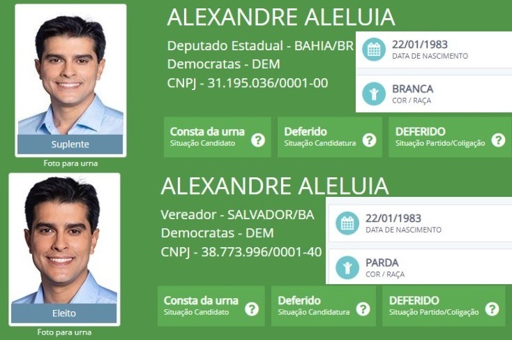 E o vereador Alexandre Aleluia (PL), que em dois anos pegou um bronze que foi capaz de fazê-lo mudar sua autodeclaração de cor no Tribunal Superior Eleitoral (TSE). Em 2018, quando foi candidato a deputado estadual, ele declarou ser branco. Em 2020, candidato a vereador, declarou ser pardo. Agora, pré-candidato a deputado federal, vai se declarar como? Fica a dúvida.