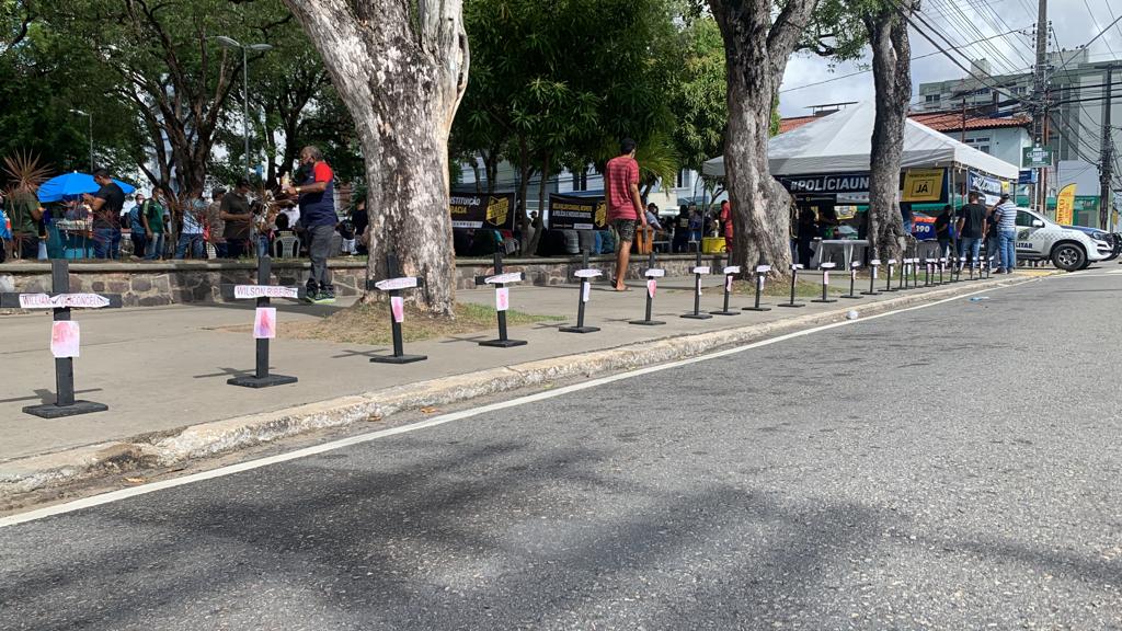 Com direito a caixão e cruzes, um movimento formado por policiais sergipanos realizou um “velório” da segurança pública e mortes de policiais, na manhã desta segunda-feira (17), em frente à Secretaria de Segurança Pública (SSP), em Aracaju. O ato é comandado pelo Movimento Polícia Unida, composto por delegados, policiais civis e militares, além de bombeiros.