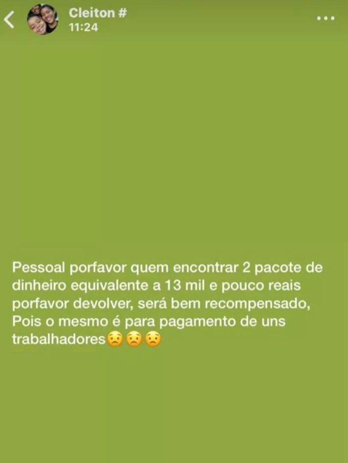 De acordo com o G1, a quantia dentro do envelope era para pagar os funcionários do seu posto de gasolina. Mas, o pacote, que estava em seu bolso, foi perdido quando o empresário se locomovia de moto. "Quando bati a mão no bolso e não achei o dinheiro, foi desespero total. Voltei no mesmo caminho, mas não achei o envelope. Coloquei no status do Instagram que tinha perdido o dinheiro e que quem achasse seria gratificado", disse.