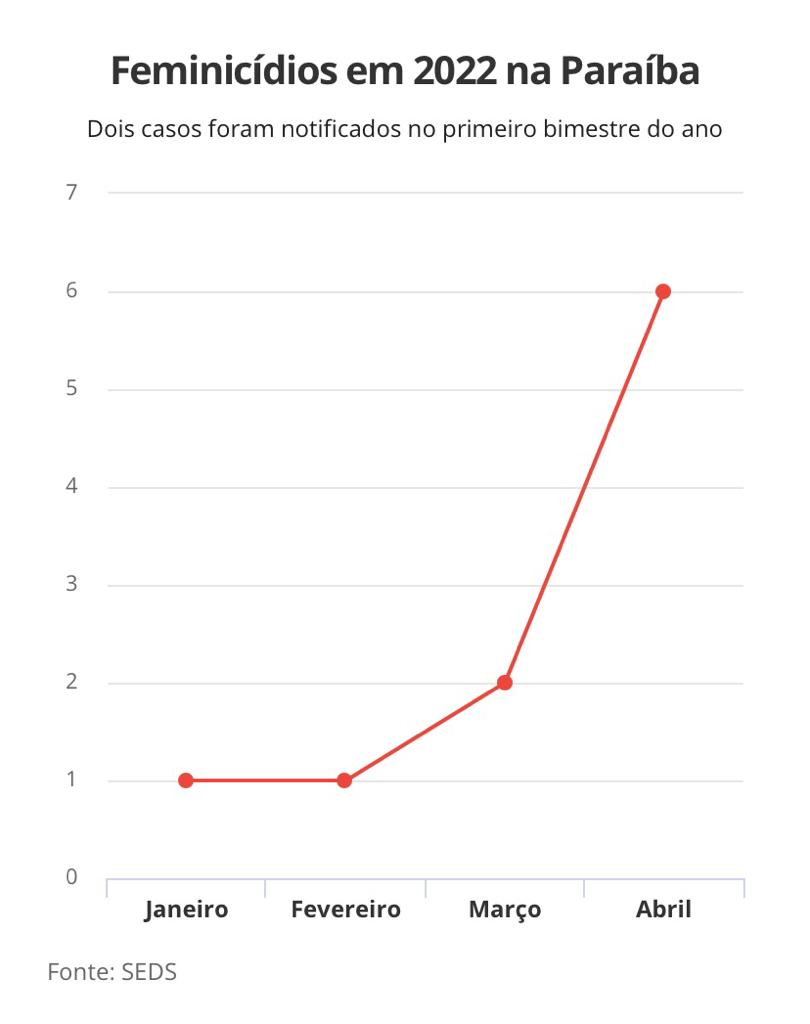 Nesse ano, em janeiro foi registrado um feminicídio que segue em investigação pela Polícia Civil; em fevereiro, foi registrado mais um caso e em março, o número aumentou para dois registros. Já em 2021, um total de 83 mulheres foram mortas, vítimas de crimes letais intencionais, na Paraíba de janeiro a dezembro. Deste total, 30 casos estão sendo investigados como feminicídio. Esse número representa 36% no número de feminicídios com relação aos assassinatos de mulheres, ou seja, uma média de duas mulheres assassinadas a cada mês de 2021 por questões de gênero.