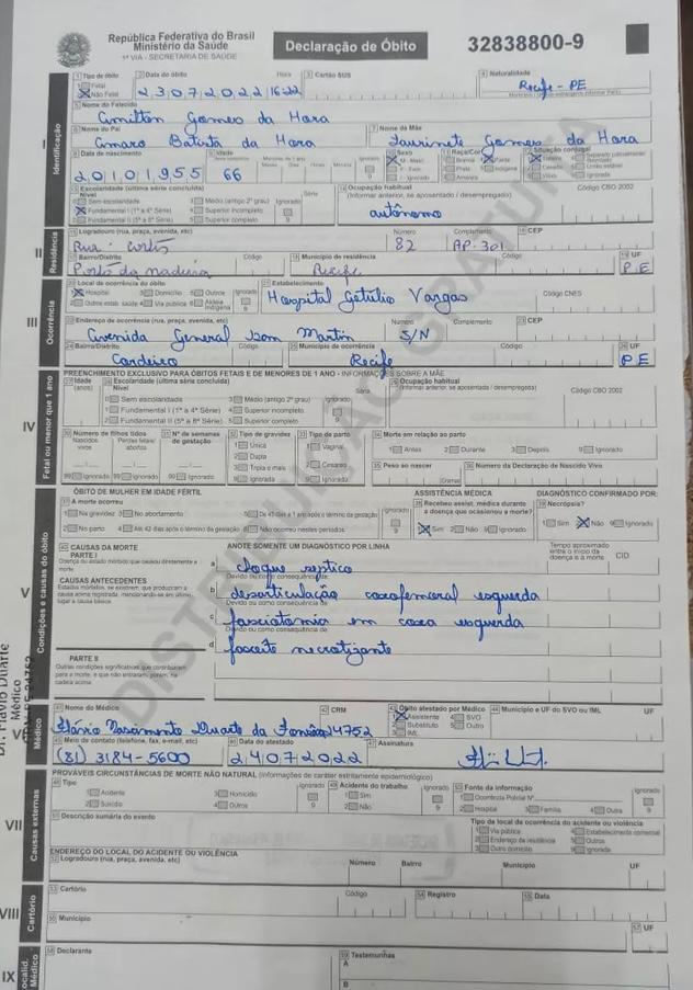 Apesar da restrição, um funcionário autorizou que Roberta tirasse uma foto da Declaração de óbito para registrar o Boletim de Ocorrência na polícia. “Quando vi, tinha escrito no documento que o corpo era de uma pessoa branca. Seu Amilton não era branco. Achei estranho. Foram checar a identidade e só autorizaram a retirada do corpo na segunda (25), com um irmão dele”, afirmou Roberta.