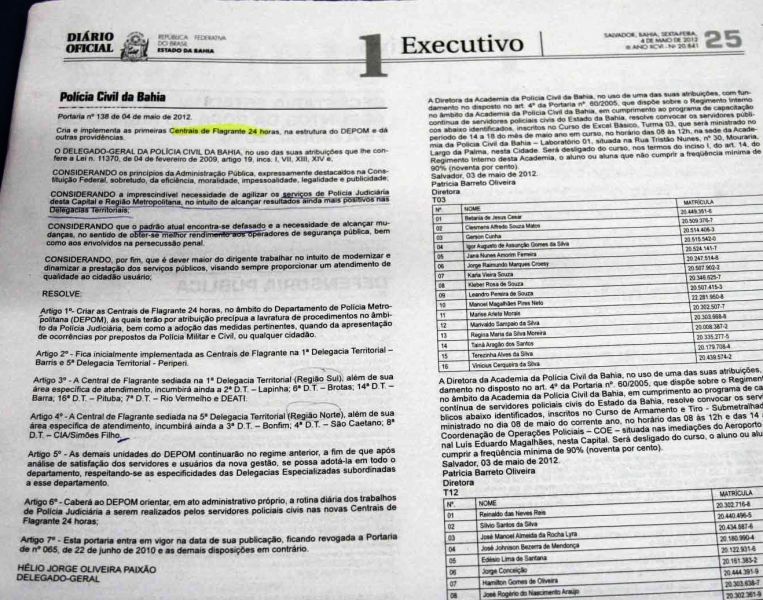 A polícia Civil da Bahia cria a Central de Flagrante 24 horas em Salvador e Região Metropolitana. De acordo com nota publicada no Diário Oficial desta sexta-feira (4), o objetivo seria otimizar o trabalho da polícia Militar ao direcionar os acusados de detidos. Mas não há informação de onde serão relocados os profissionais que executarão a nova missão e como ficará a unidade com o déficit. Consta no Diário que: Para o delegado Helio Jorge Paixão, o atual serviço de polícia Judiciária da capital e RMS está defasado e a medida visa alcançar melhor rendimento no setor.