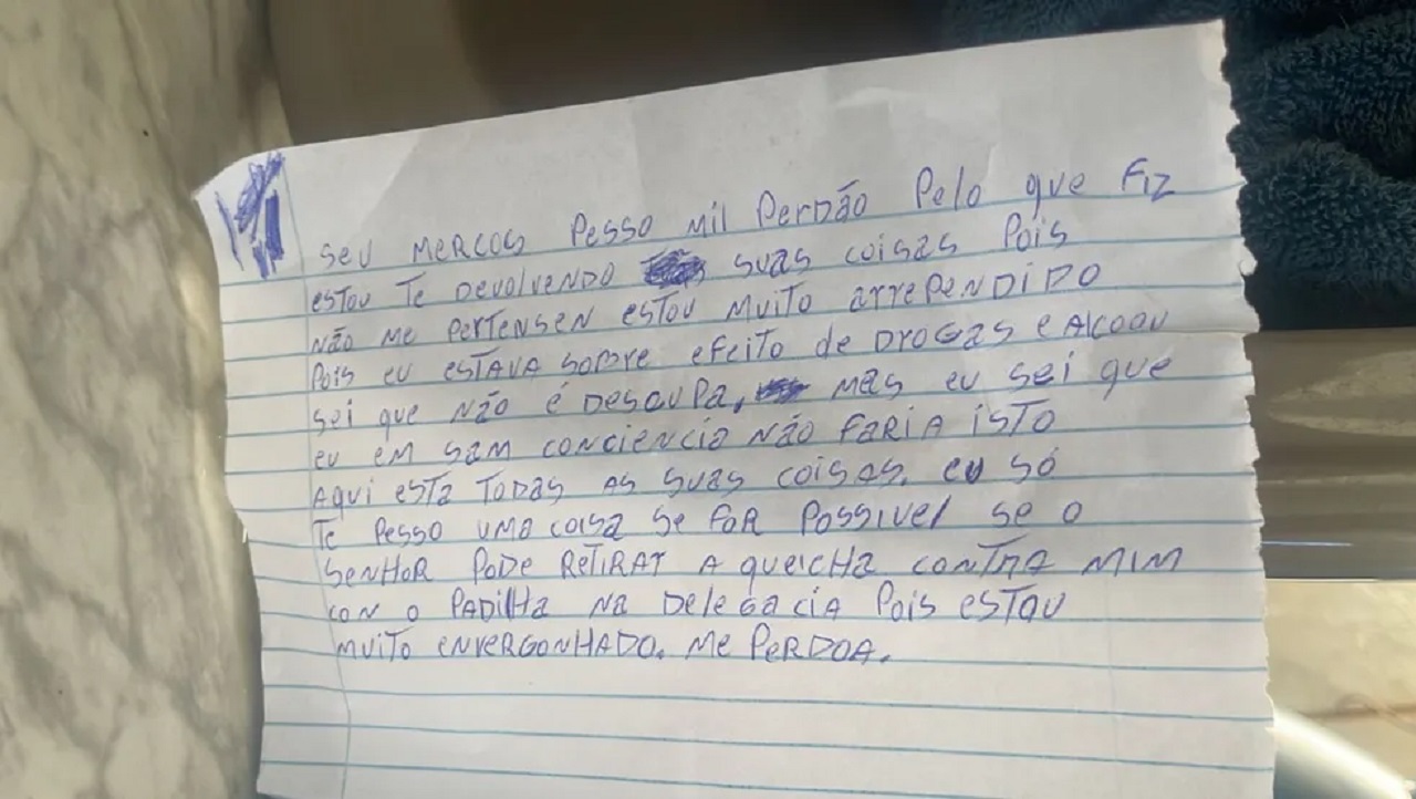 "Peço mil perdão pelo que fiz. Estou te devolvendo suas coisas, pois não me pertencem. Estou muito arrependido, pois eu estava sobre efeito de drogas e álcool. Sei que não é desculpa, mas eu em sã consciência não faria isto. Aqui estão todas as suas coisas, eu só te peço uma coisa. Se for possível, se o senhor pode retirar a queixa contra mim com o Padilha na delegacia, pois estou muito envergonhado. Me perdoa", diz trecho da carta.