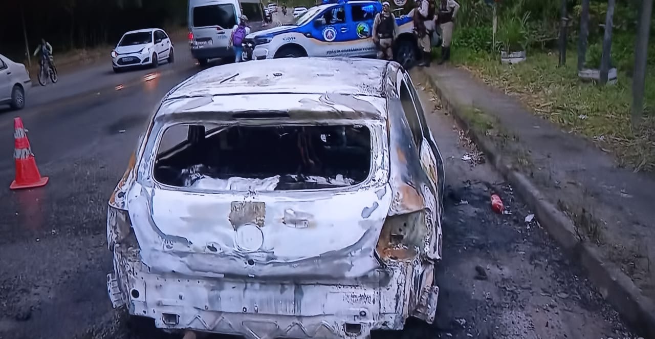 Um caso com enredo cinematográfico foi registrado na manhã desta segunda-feira (15), em Salvador. Um veículo foi encontrado completamente incendiado na Estrada do Derba. O veículo teria entrado em chamas, após o motorista colidir em outro carro na tentativa de fugir de um assalto.
