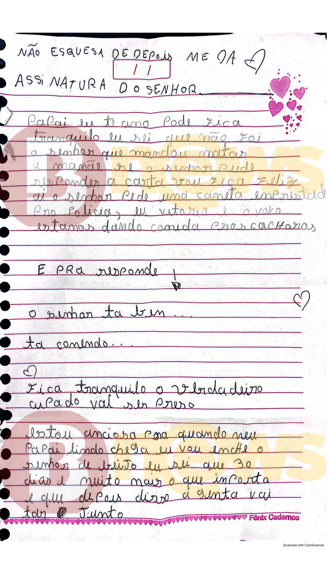 "Papai eu te amo. Pode ficar tranquilo, eu sei que não foi o senhor que mandou matar a mamãe. Se o senhor puder responder a carta, vou ficar feliz. [...] Fica tranquilo, o verdeiro culpado vai ser preso”, diz a criança em carta destinada ao pai dela.