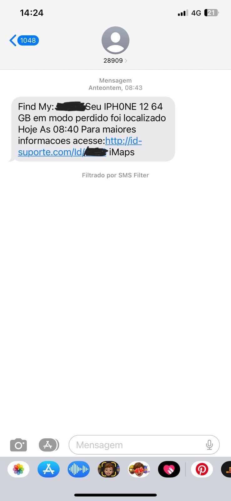 Na mensagem de texto, eles afirmam que o celular da vítima estava em 'Modo Perdido' e que, para saber a localização do aparelho, era necessário acessar o link enviado e colocar dados como o e-mail e senha colocados para proteger o celular, entre outras informações.