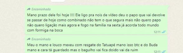 Nas mensagens, as ameaças são claras. “Mano, prazo dele foi hoje !!!! Ele ligo pra nois [sic] de vídeo. Deu o papo que vai devolver. Se passar de hoje como combinado não tem o que segurar mais. Não quero papo, não quero ligação mais. Agora é fogo na família. Na sexta já acorda todo mundo com formiga na boca. Meu o mano é louco, mexeu com resgate do Tatuapé, mano, isso btc e do Buda mano e cara tá guardado. Mas o bagulho vai ficar doido. Vai dar ruim”, diz o texto enviado pelo WhatsApp. (veja abaixo).
