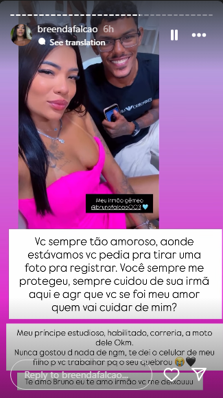 Nas redes sociais, Brenda desabafou sobre a partida de Bruno e compartilhou diversas fotos ao lado do irmão. "Eu te amo meu príncipe, meu irmão. Sempre foi nós 4 amor, você me completava. Eu te amo irmão, não sei o que será de mim sem você", escreveu.