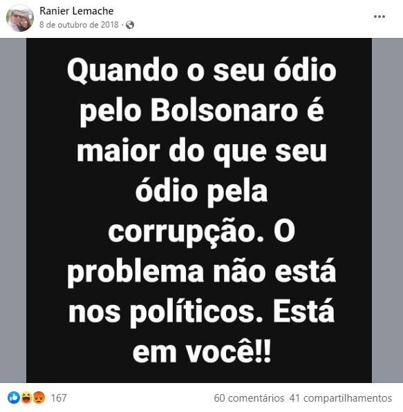 "Decerto não era o momento, tampouco o local adequado, mas, as duas únicas frases ditas por mim foram: "VAMOS BOLSONARO!!!" e "VOCÊ AJUDOU O BRASIL PRA C..." (essa última em evidente tom de ironia, haja vista a divergência política que, com todo respeito, não configura nenhuma ofensa)" (Ranier Lamache)