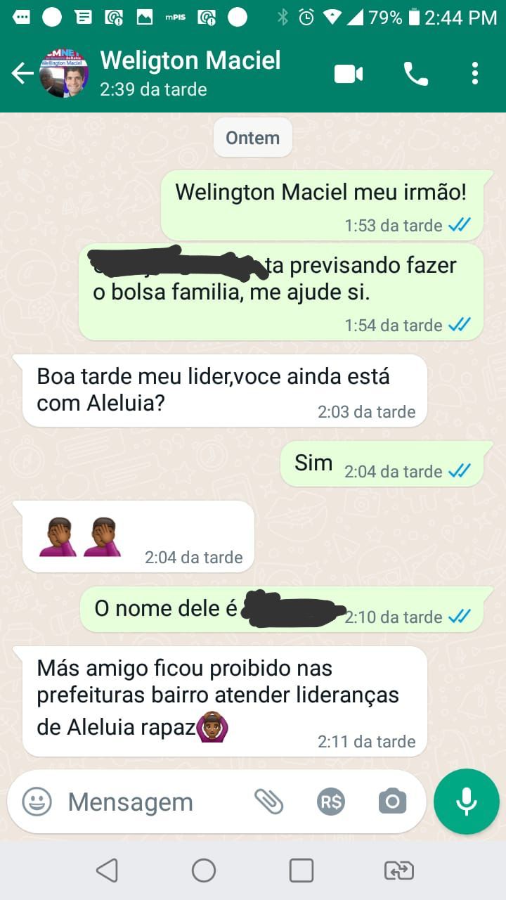 Aleluia trouxe a público o print de uma conversa em que uma liderança da Cidade Baixa teve o pedido de cadastro no Auxílio Brasil rejeitado por ser aliado dele. A solicitação foi feita via WhatsApp a um supervisor da prefeitura-bairro, que passa a perguntar sobre a vinculação partidária com Aleluia.