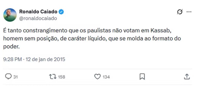 "Homem sem posição, de caráter líquido, que se molda ao formato do poder. Constrangimento é a lista de crimes de Kassab, que transforma a política em negociata, corrupção e fraude eleitoral", publicou Caiado.