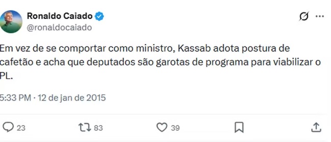 "Em vez de se comportar como ministro, Kassab adota postura de cafetão e acha que deputados são garotas de programa para viabilizar o PL", publicou Caiado, em janeiro de 2015, na antiga rede social Twitter (atualmente X).